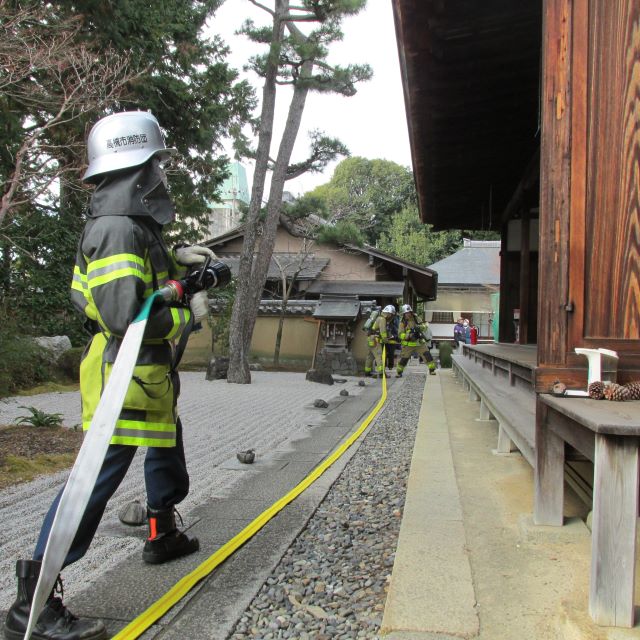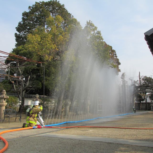 毎年1月26日は文化財防火デーです。制定は、昭和24年1月26日に現存する世界最古の木造建造物である法隆寺の金堂が炎上し、壁画が焼損したことに基づき、昭和30年に毎年1月26日を文化財防火デーとすることが定められました。文化財防火デーは、文化財を火災、震災、その他の災害から守るとともに、全国的に文化財防火運動を展開し、国民一般の文化財愛護に関する意識の高揚を図ることを目的としています。中消防署管内においても、令和7年1月22日に普門寺、1月23日に三輪神社、1月24日に慶瑞寺。1月25日に本照寺で消防訓練が実施されました。