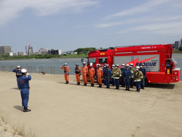 淀川河川公園大塚地区船着場にて、河川内で水難事故が発生し、要救助者1名が助けを求めているという想定で訓練を実施しました。