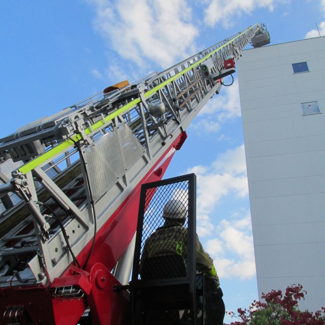 到着した消防隊に逃げ遅れ等の報告を行っています。