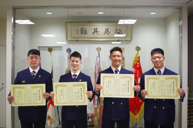 野辺消防士(機関員) 大脊戸消防士長(隊長) 木田消防士(隊員) 髙柳消防士(隊員)