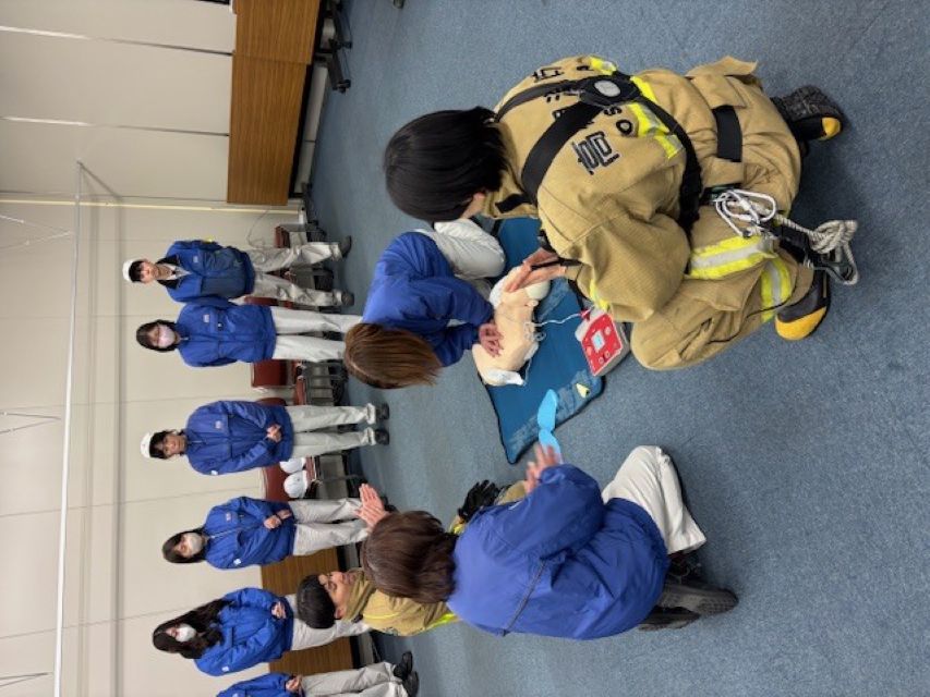 水消火器を使用した初期消火訓練とAEDによる心肺蘇生法の様子です。