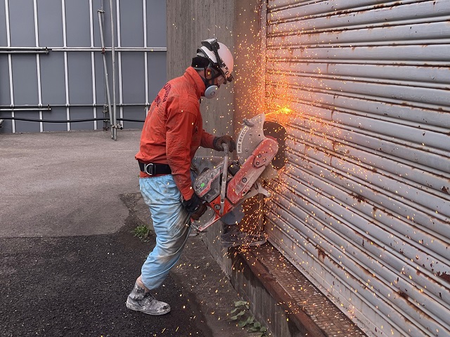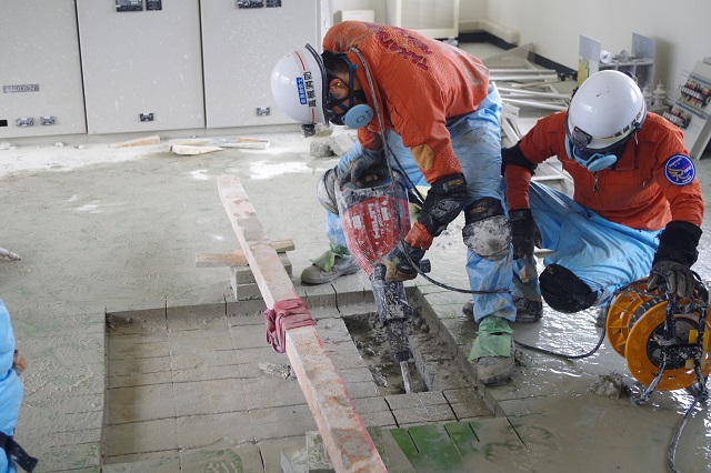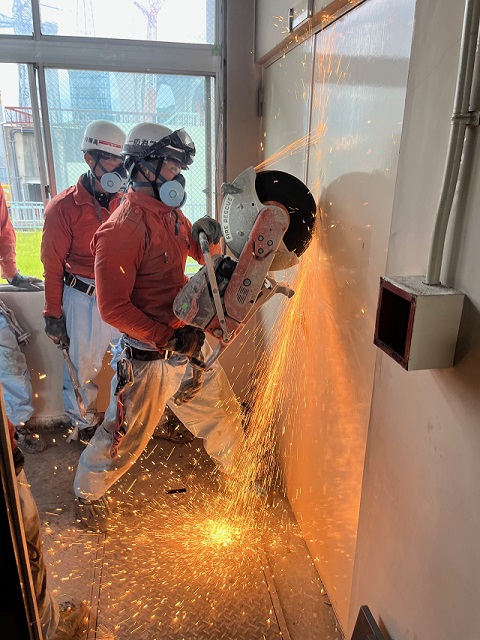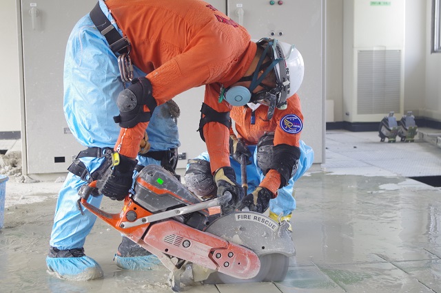 「鉄筋コンクリート造の建物が地震により倒壊し、倒壊した1階部分に要救助者が取り残されている。」との想定で、2階から1階への進入路を確保するため、エンジンカッターや削岩機で床を破壊する『ブリーチング訓練』を実施したほか、エンジンカッターを使用して、鉄扉やシャッターの破壊訓練を実施しました。