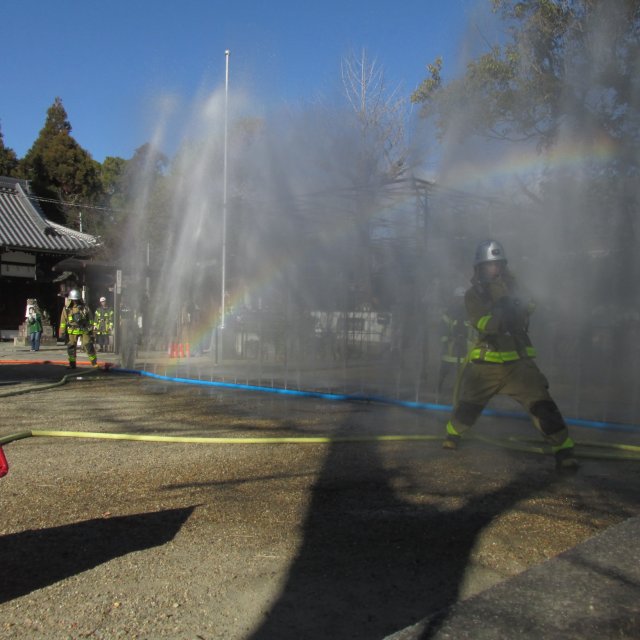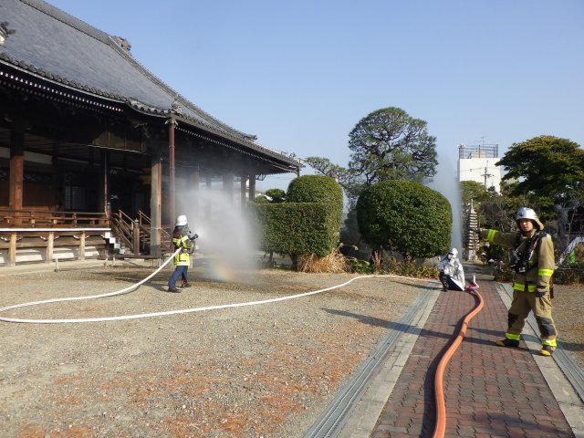 1月22日に普門寺にて消防訓練を実施しました。消防隊による消火訓練です。